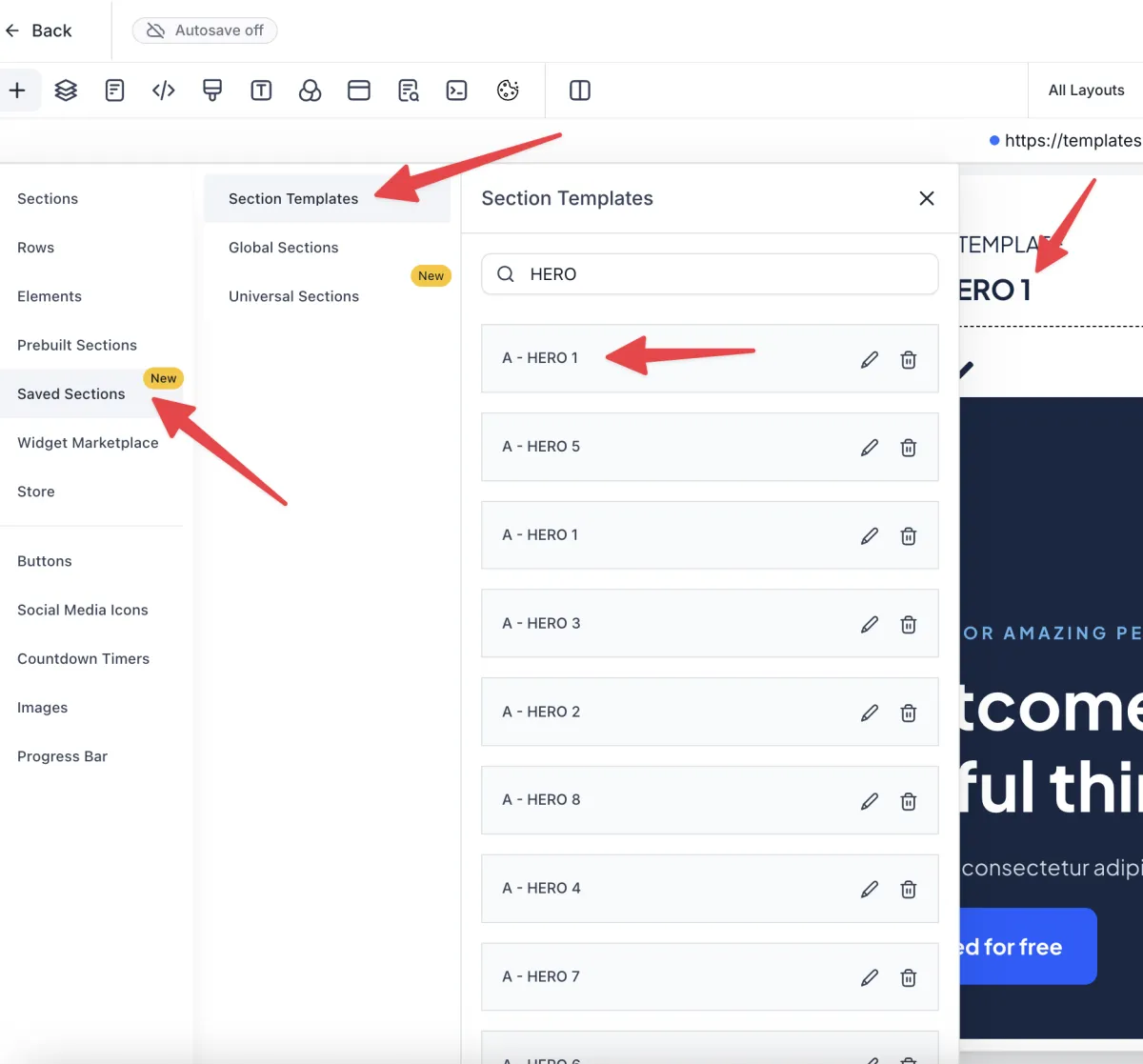 Finde dein gewünschte Section und geh dann im Page Builder auf Saved Sections > Section Templates> und lade die gewünschte Vorlage mit der entsprechenden Section ID auf deine Funnel page oder Website Page.